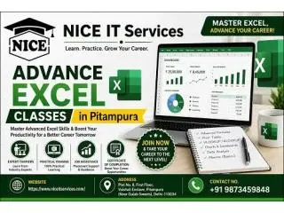 Nice IT Services offers industry-focused Advance Excel Classes in Pitampura designed for students, professionals, and job seekers. The course covers advanced formulas, pivot tables, dashboards, and data analysis techniques that are essential in today’s workplace. With expert trainers and practical sessions, learners gain hands-on experience to solve real business problems. Whether you want to improve reporting skills or boost career opportunities, this course helps you achieve your goals. Flexible batch timings and affordable fees make it easy to start learning. Enroll today at Nice IT Services and upgrade your Excel skills with confidence.