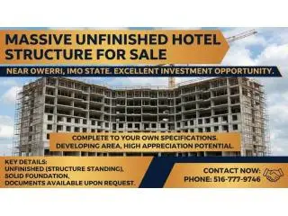 Unfinished hotel structure available for immediate sale near Owerri, Imo State. excellent opportunity for investors to complete to their own specifications. Situated in a developing area with high appreciation potential. Ideal for diaspora buyers looking to establish a hospitality business or service apartments back home. Solid foundation and structural work already done.