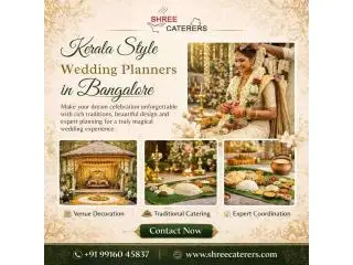 Shree Caterers is a trusted choice for Kerala Style Wedding Planners in Bangalore, delivering beautiful weddings inspired by classic Kerala traditions and culture. We plan and organize every detail, including the decoration, Kerala-style catering, stage arrangements and complete event management. Our team focuses on creativity, quality service and smooth coordination to make your wedding celebration truly memorable. We make sure that your special day reflects quality, tradition and joy for you and your guests. Contact Shree Caterers today to arrange your dream Kerala-style wedding in Bangalore!