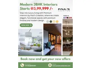 Paul's Creation stands out among luxury interior designers in Bangalore, creating stylish and functional spaces designed for modern lifestyles. We are experts at transforming apartments, villas, and premium homes with innovative concepts and high-quality finishes. Our experience covers modular kitchens, wardrobes, living rooms, and bedrooms, designed to maximize space and elegance. We take pride in offering our clients a variety of high-quality luxury apartments with the highest levels of comfort, sophistication, and style. Our commitment to using top-quality materials, delivering projects on time, and offering cost-effective solutions guarantees personalized service. Get your free consultation with Paul's Creation today and create the home of your dreams.